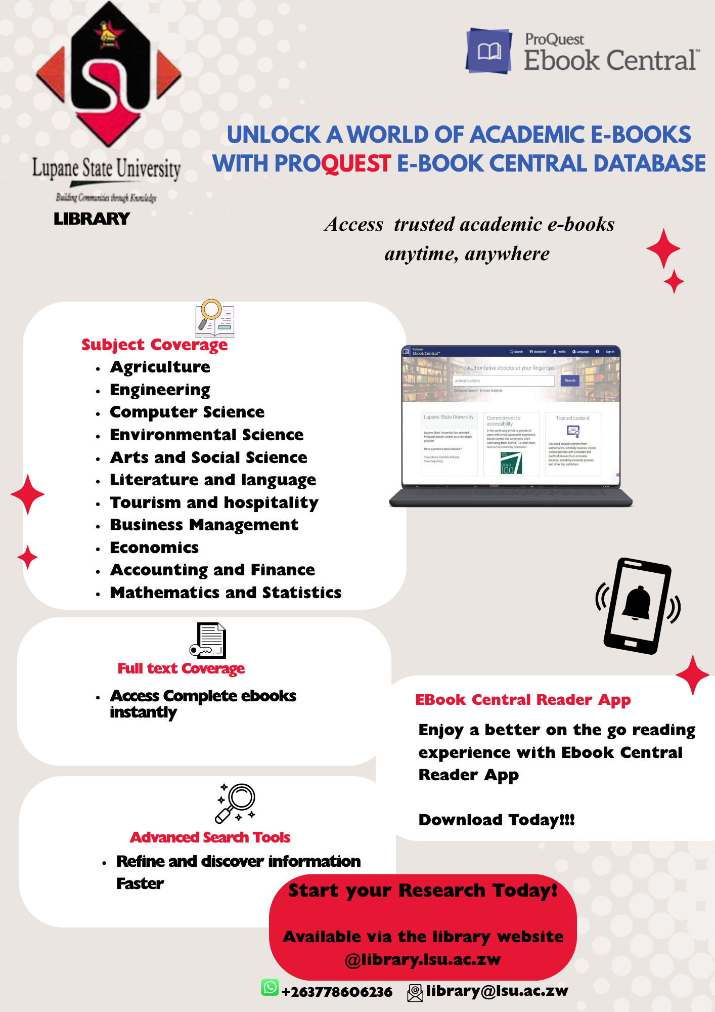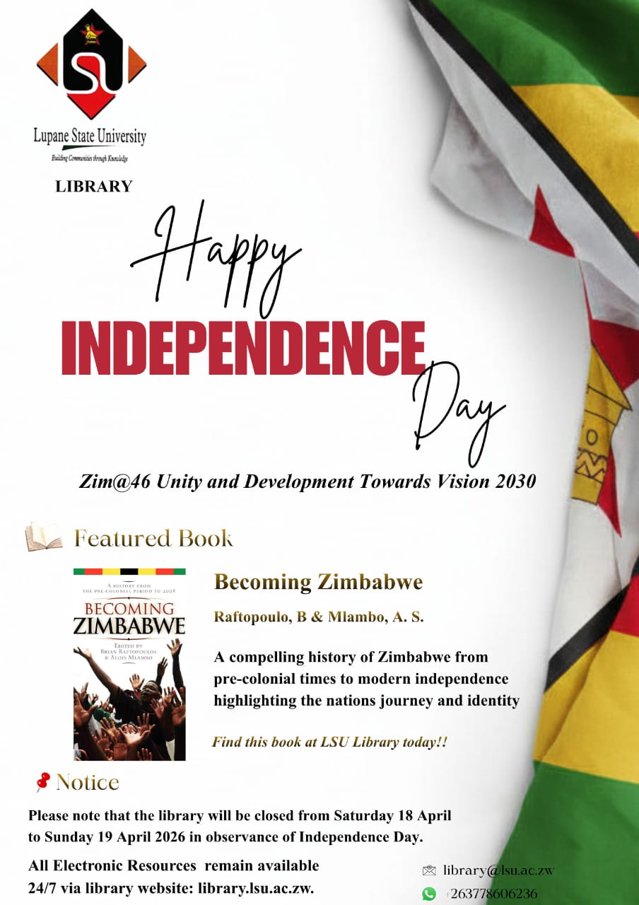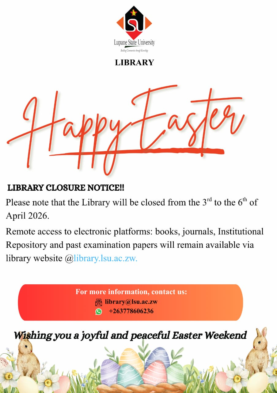 Welcome to the Lupane State University Library. Step inside, ignite your curiosity, and embark on a journey of discovery. Whether you're a seasoned scholar, a wide-eyed First year student, or simply a lifelong learner, this library is your intellectual oasis. Within these walls, and beyond them through our website, lies a universe of knowledge waiting to be explored.